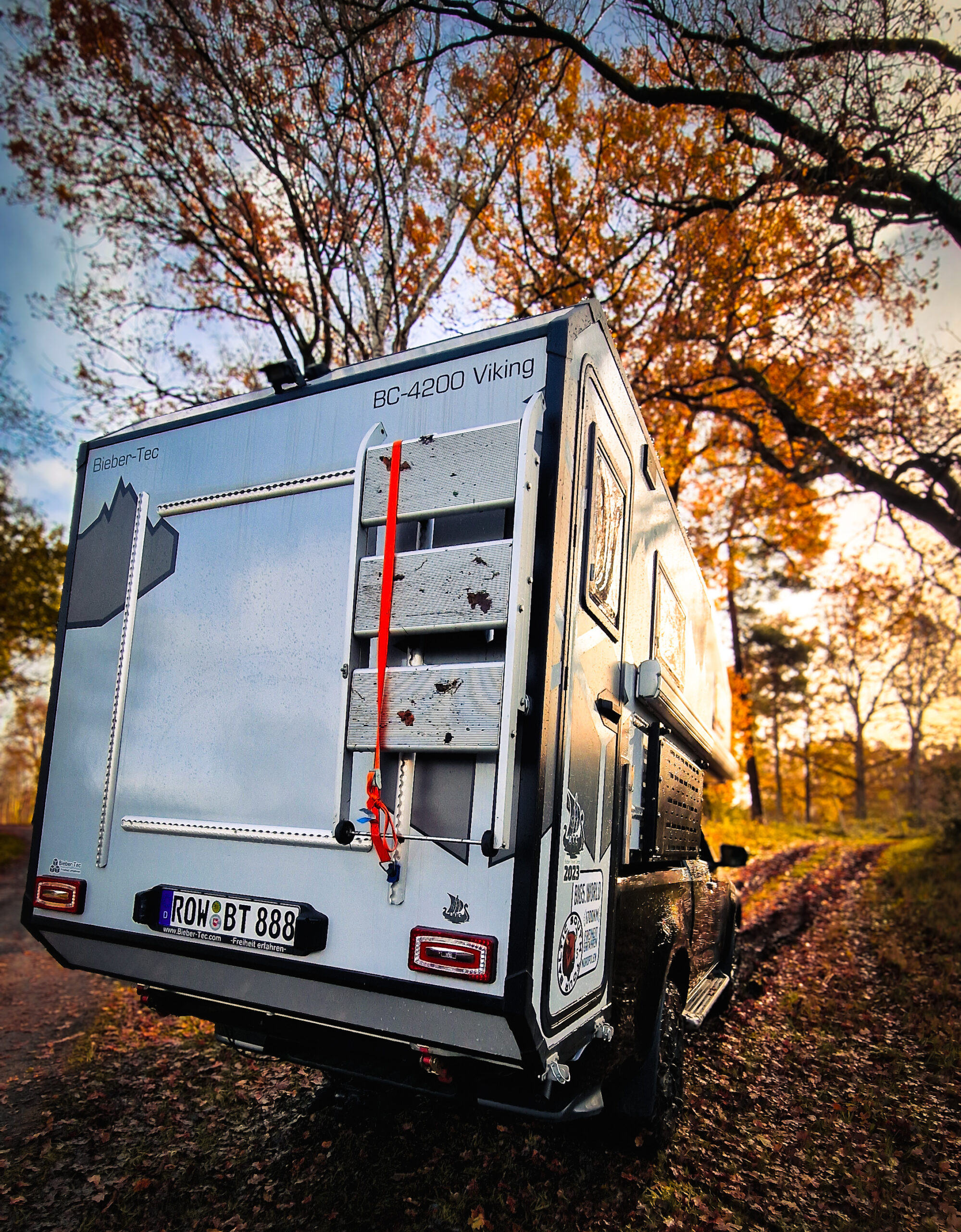 Unsere Viking Serie ist mit einem Seiteneingang konstruiert, um die Rückwand für Gepäck wie zu Beispiel Beispiel Fahrradträger, Stauboxen, Reservekanister oder Axthalter nutzen zu können.