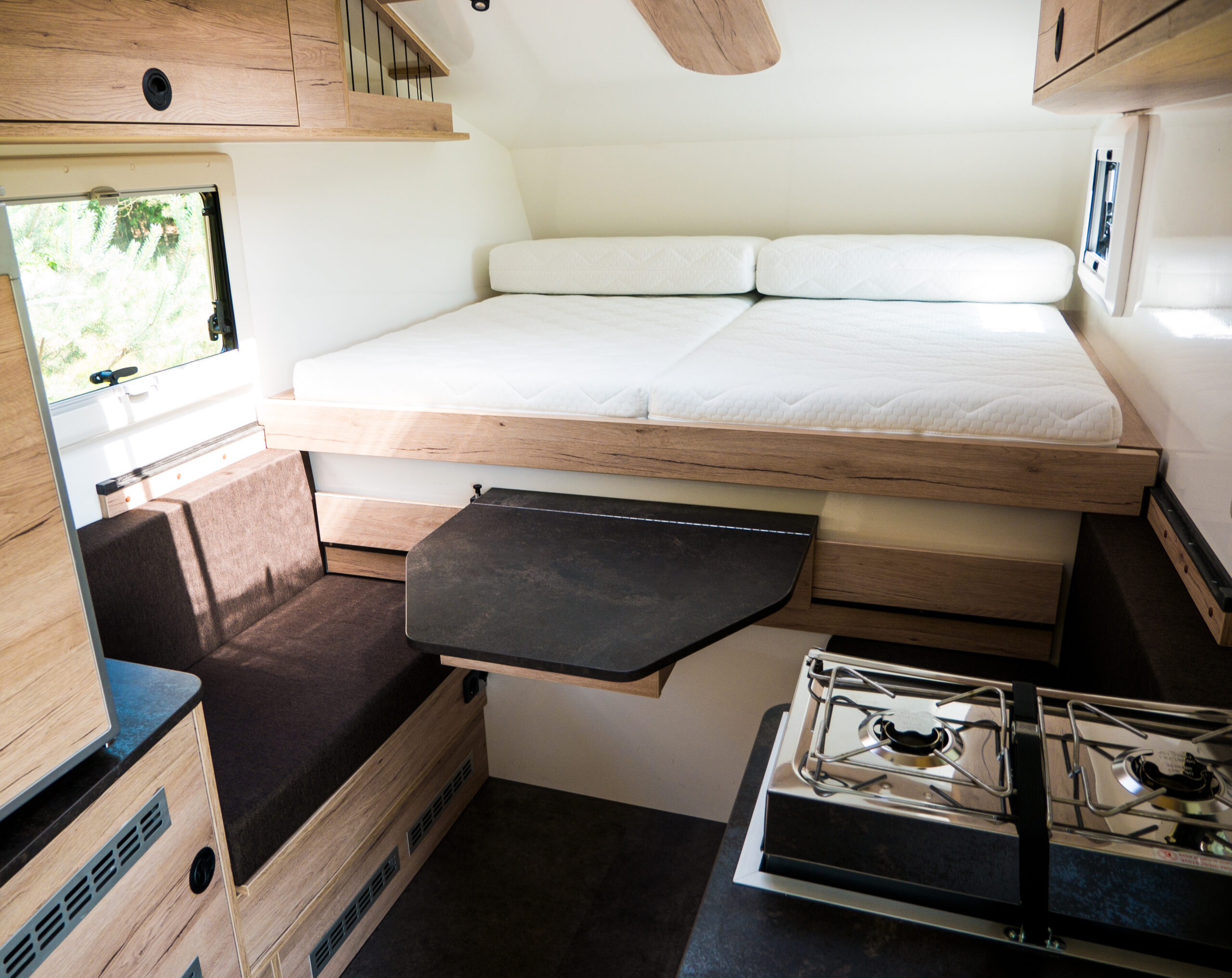 Zusätzlich besticht sie mit einem üppig gestalteten Innenraum mit geräumigem Badezimmer, einer Küchen-Sitzgruppe und ist somit auch für lange Reisen konstruiert.